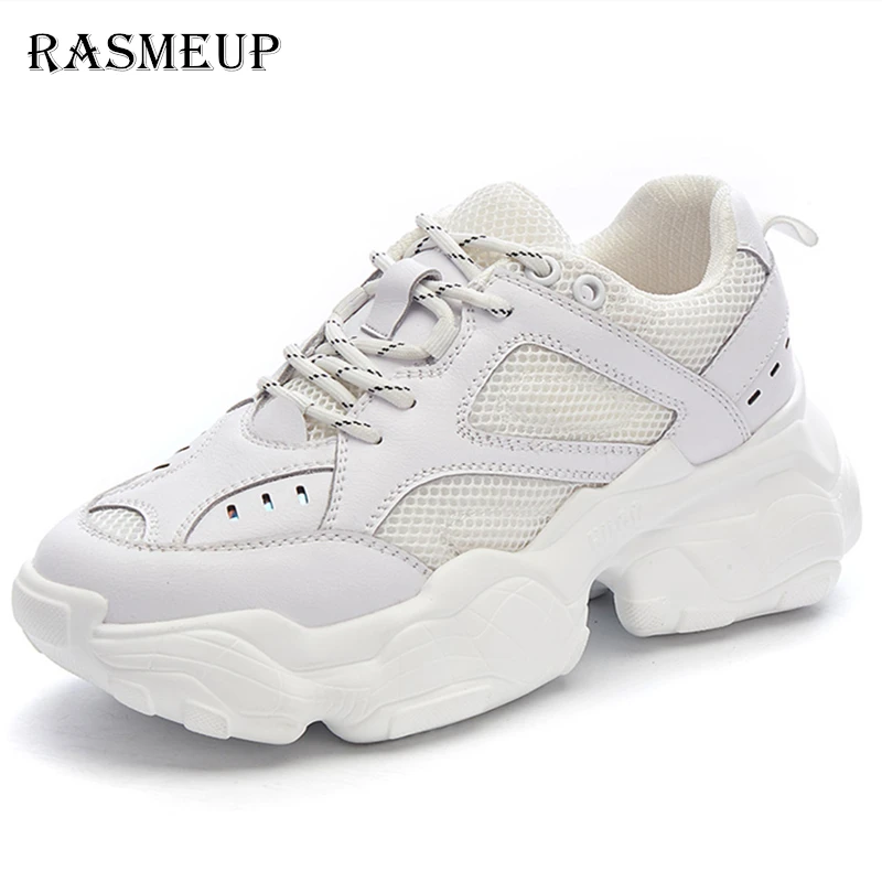Price RASMEUP Leather Mesh Women's Chunky Sneakers White Fashion Women Lace-up Platform Black Sneaker 2018 Thick Soled Woman ShoesGet 75% OFF, VALID UNTIL TOMORROW