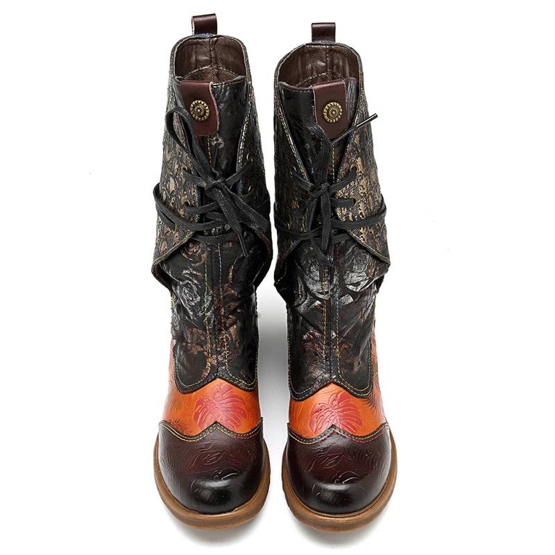 .image of Socofy Genuine Leather Mid-calf Western Boots Women Shoes Woman Vintage Casual Lace-up Cowboy Winte