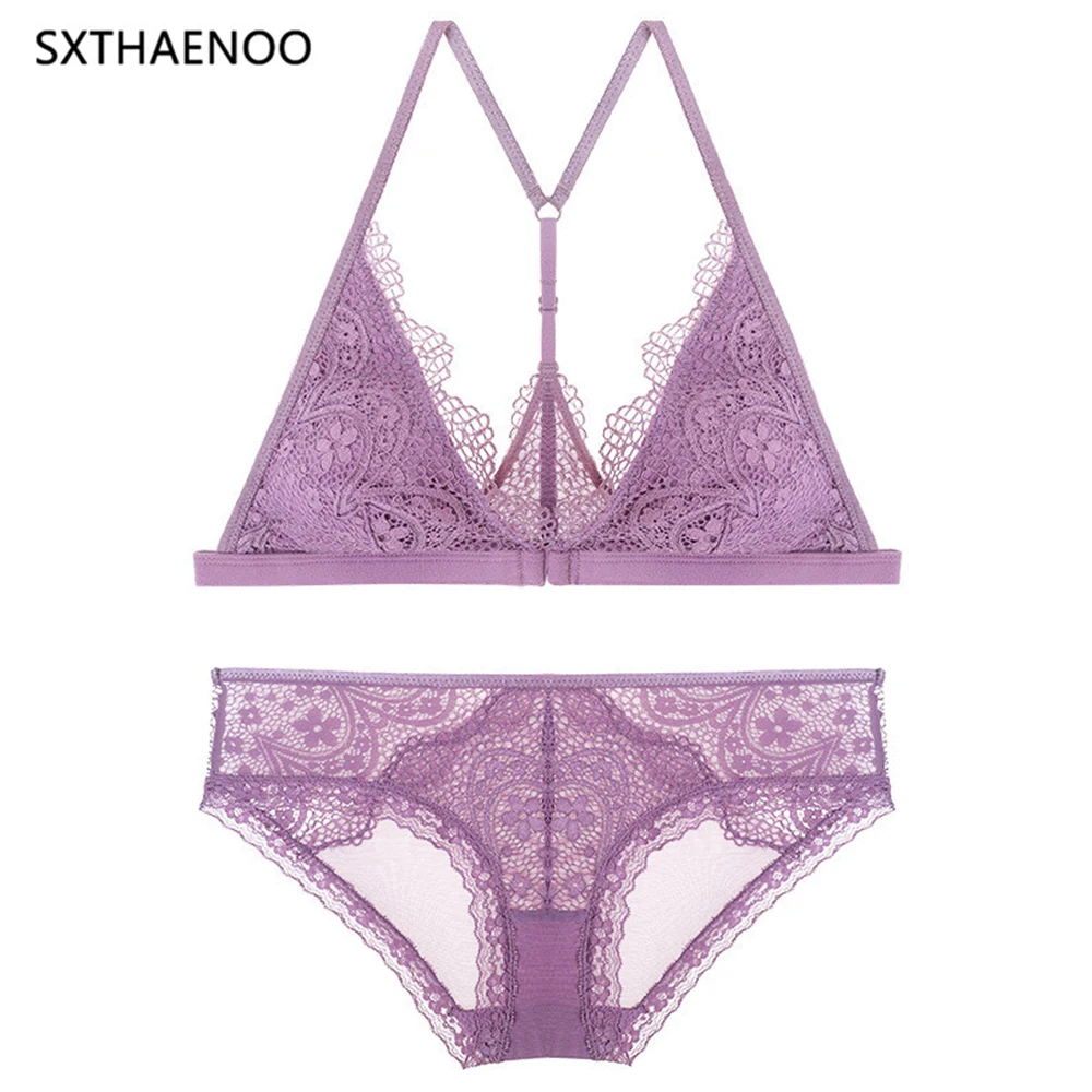.image of SXTHAENOO Sexy Bra Set with Beautiful Back Triangle Cup Without Rims Bra Lace Slim Front Button Und