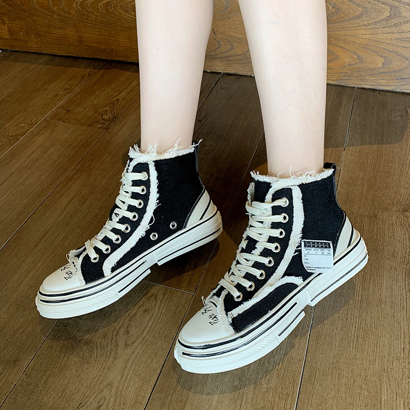 Related Product for Spring New Women Sneakers Girls Shoes Canvas High Top Black Lace Up Lady Fashion Casual Shoes Solid