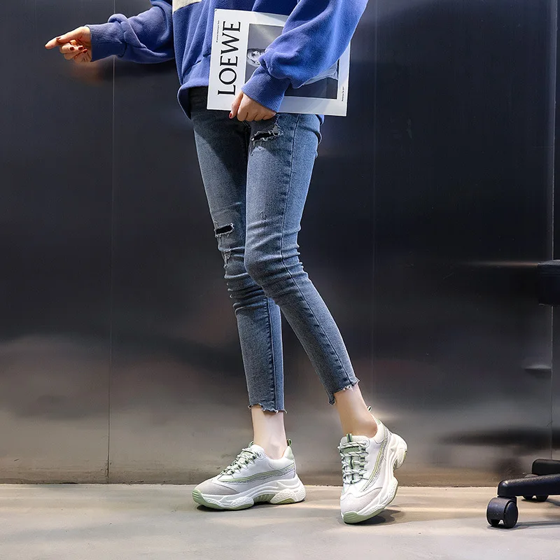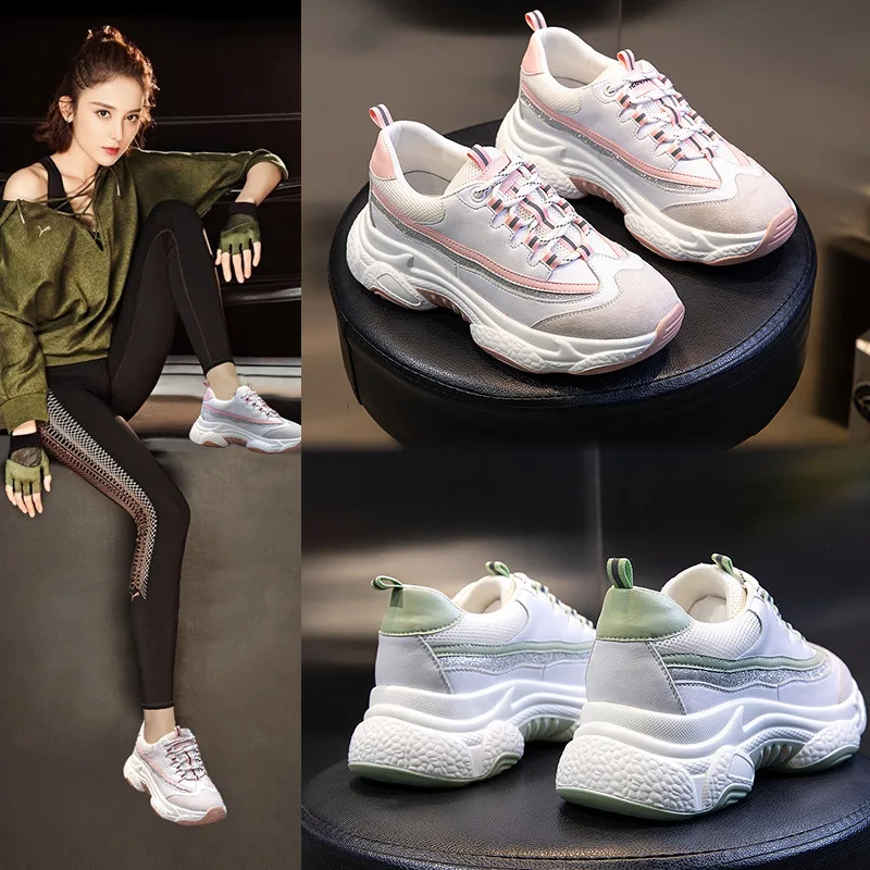 Yiluan Leather Daddy Shoes Women Sports 2020 Spring New White Shoes Woman Casual Shoes Lace Up Sneakers Breathable Mesh