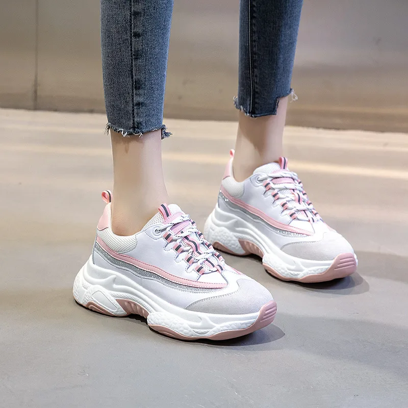 Spring Leather Shoes Women Sports 2020 New Casual Platform Daddy Shoes Lace-up Woman Shallow Sneakers Mesh breathable
