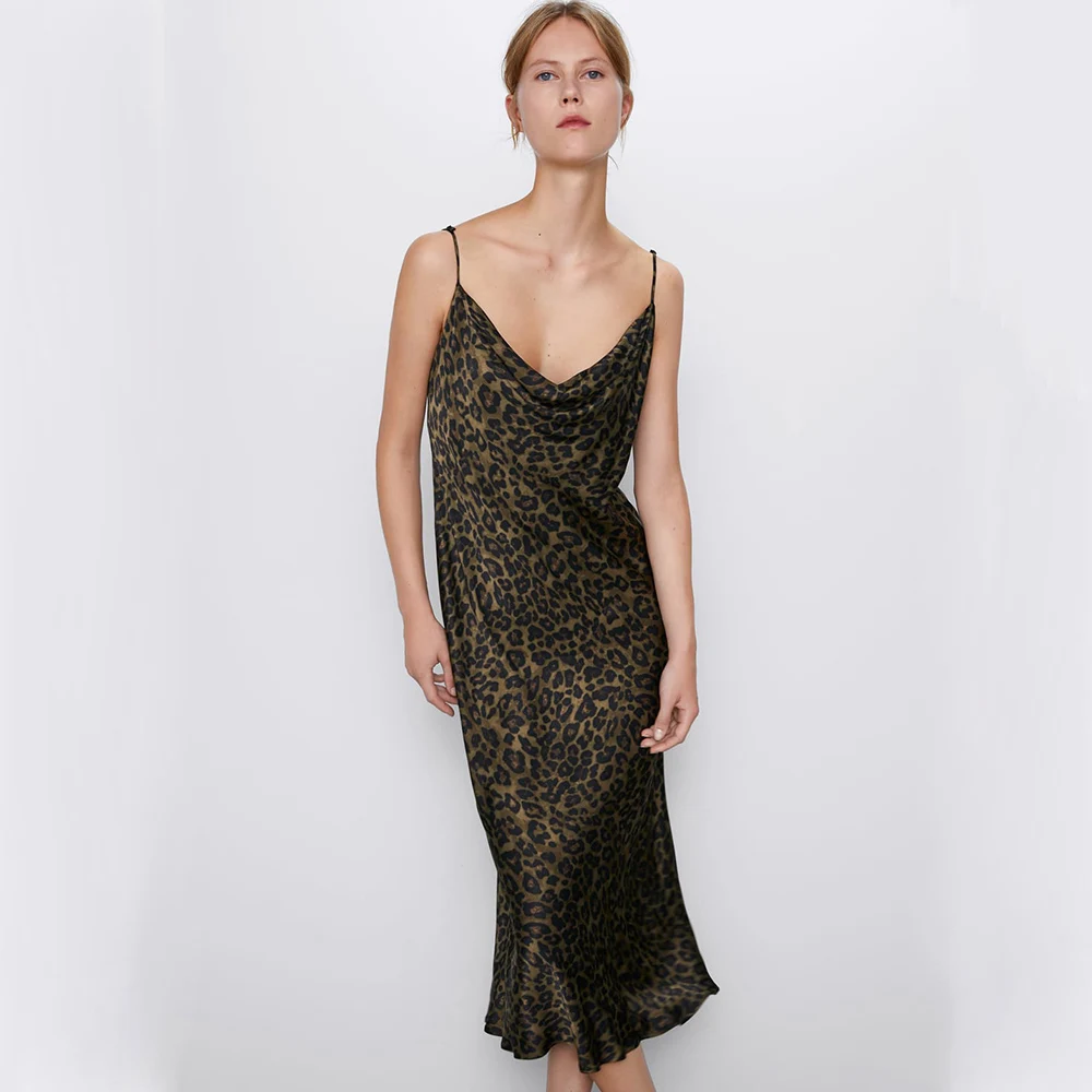 Special Price for ZA Women's Draped Collar Leopard Dress Mid-calf Adjustable Thin Strap Sexy Dress Long Beach Loose S